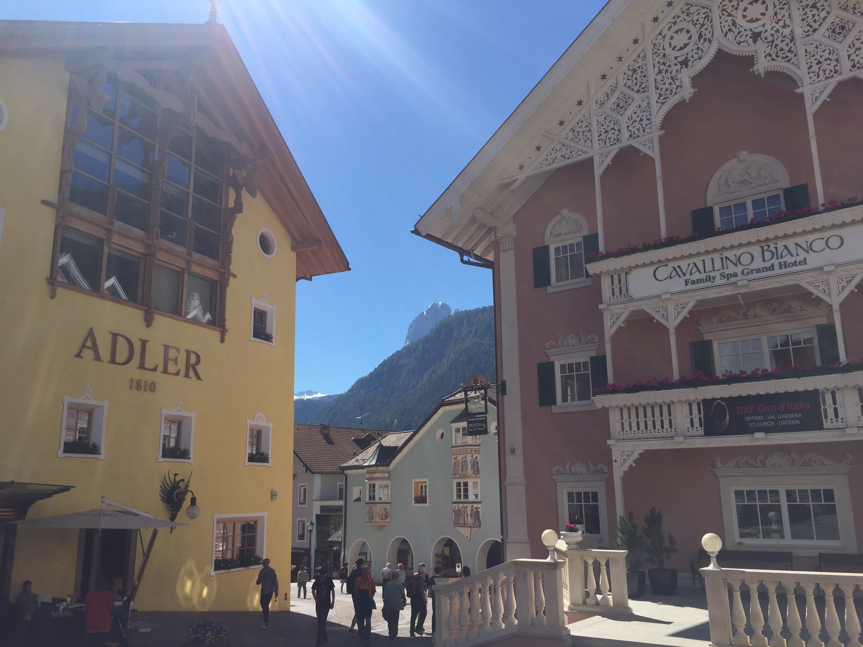 I worked up an appetite and headed to Ortisei village for dinner. Ortisei is a tiny charming town in the middle of the mountains. It’s one of the most picturesque places in South Tyrol, with colorful architecture and winding alleys.